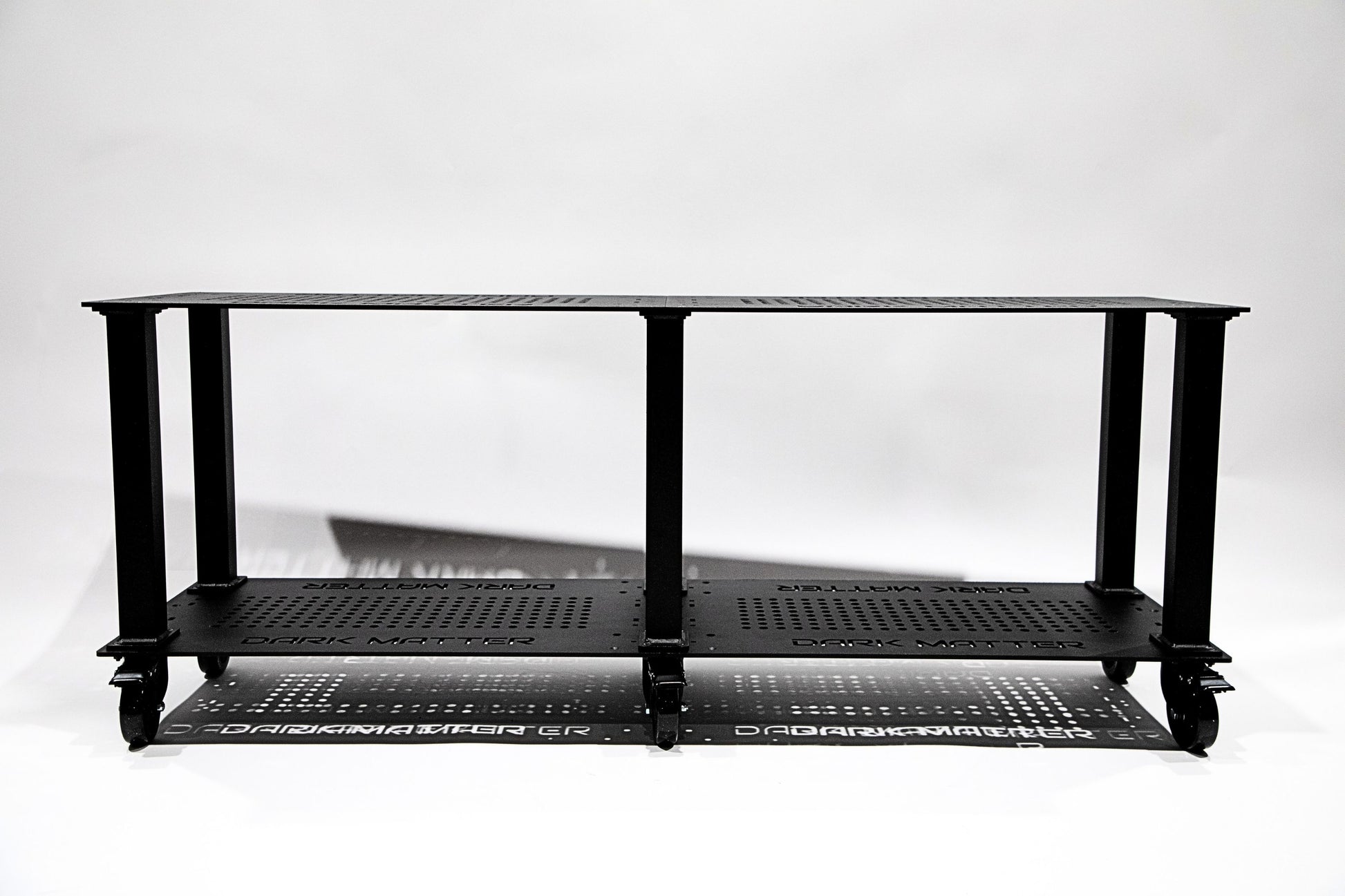 This Rolling Modular Stand has pre-cut holes to attach to your Dark Matter Cab. The Stand is 24" tall x 61" Wide x 18" Deep and weighs 69 LBS. Includes 6x Casters, 4x Decks, 6x Long Spines and Hardware. Ships un-assembled. The center of each deck also feature an 8 x 22 array of holes exactly 1" apart to mount most common lighting fixtures.